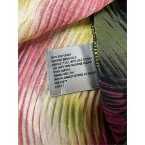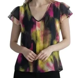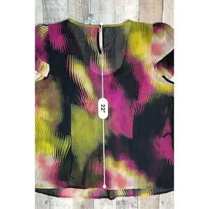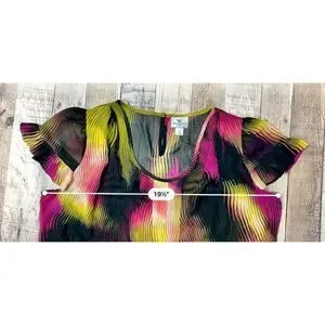 Worthington Petite Multi-color Sheer Cap Sleeve Blouse sz PL. Super cute scoop neck blouse with ruffle cap sleeve. 100% Polyester. Machine washable. Item in excellent gently used condition. No known rips, tears, holes, stains or defects. Did not come with belt.