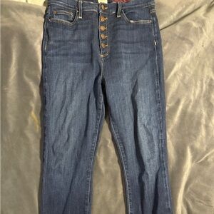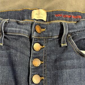 Chic high rise jeans with button details. Dark blue denim for versatile styling. Perfect for casual or dressy looks.