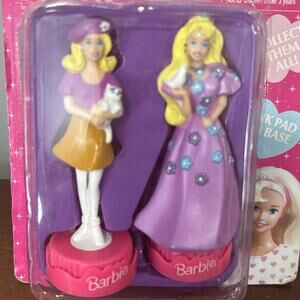 The product is a vintage 1996 Mattel Barbie figurine stampers set, featuring the character Barbie. This collectible item was manufactured in 1996 and comes in its original packaging, making it a desirable gift set for fans of Barbie and collectors of vintage toys. Perfect for a party occasion, this item would make a unique addition to any Barbie enthusiast's collection.