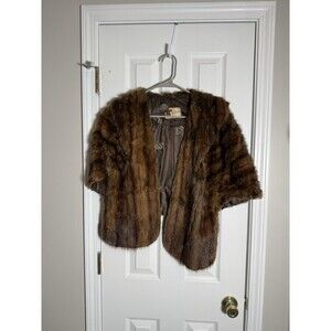 Vintage womens real fur capelet-style jacket by Dale Furs in rich brown fur with a soft, full texture and cropped silhouette. Open front design with wide sleeves and a fully lined brown satin interior featuring embroidered details. Original Dale Furs label present with visible wear and fraying consistent with age. Interior lining shows visible wear and discoloration as shown; fur remains intact with natural vintage wear. No size tag presentplease use measurements for fit. Approximate flat measurements: pit to pit (across back/sleeves) ~29 inches, length from shoulder to hem ~20 inches. This piece fits more like a capelet than a structured jacket. Please review all photos carefully for condition and details. Sold as-is due to vintage nature. Ships fast usually within 24 hours.