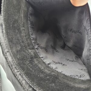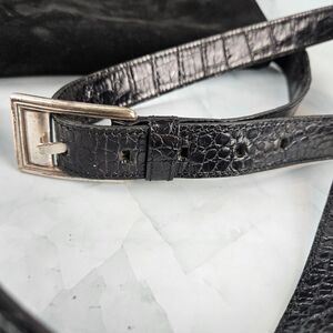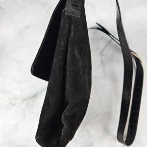 Vintage black suede small bag from Fossil! Silver hardware snap closure, flap style opening, two compartments with one zippered pocket. Croc patent leather crossbody strap with adjustable length. See photos for signs of use!