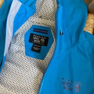 Mountain Hardwear blue rain jacket. Works as a windbreaker. Adjustable hood; zipper pulls.