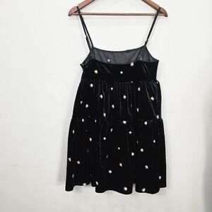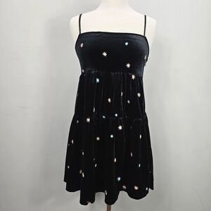 Babydoll Mini Dress M Black Velvet Embroidered Whimsigoth Strappy Tiered Fairy