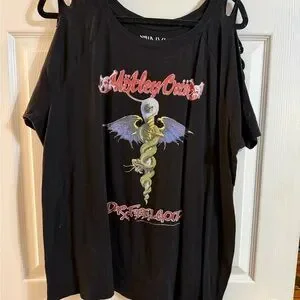 Official Mötley Crüe “Dr. Feelgood” graphic tee by The Vinyl Icons in women’s size 2. Features edgy cold-shoulder cutouts with ladder strap details and classic black rock tee styling. Soft cotton-blend fabric with relaxed fit — perfect for concerts, festivals, or everyday rocker vibes.