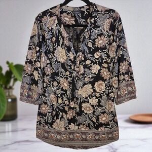 Lucky Brand Women's Black/Rose Floral V Neck Top Size Plus 1X