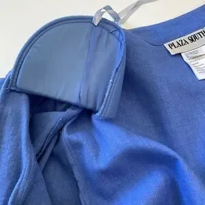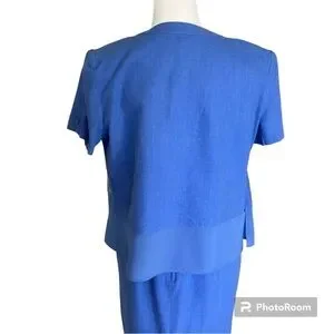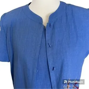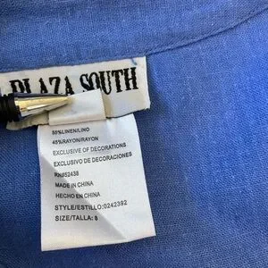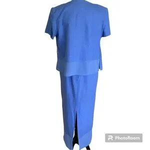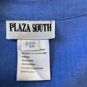 This stunning vintage two piece linen blend coordinated set features a maxi dress and short sleeve mandarin collar jacket top in a gorgeous blue color with beautiful floral and butterfly embroidery on the top and dress. The sleeveless dress zips in the back and has a chiffon border at the hemline, a kick vent and is fully lined. The top features chiffon at the hemline, pretty toggle buttons and shoulder pads. Perfect for casual wear and dress events