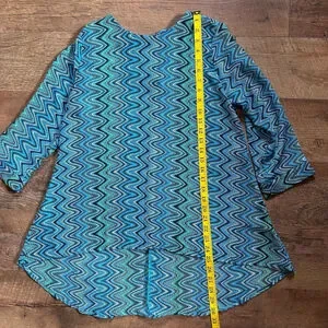 This is a pre-owned women's top from The Limited, size S. It features a blue, green, and black zigzag pattern. The top has 3/4 sleeves and a high-low hem. The material appears to be a lightweight knit. The top measures approximately 19 inches across the chest and 30 inches in length from the shoulder to the longest point of the hem. There are no visible stains or tears.