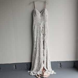 NWT Laudae off-white/nude fitted lace wedding dress with high slit and train
