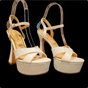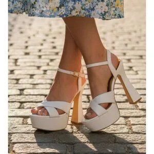 These high heel platform sandals feature a sleek white faux leather design with an adjustable ankle strap and sturdy block heels. Ideal for adding height and elegance to outfits, they offer a comfortable fit and stylish appeal thanks to their cross-strap detail and supportive platform sole.
