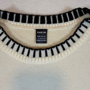 Keywords: SHEIN sweater, knit top, striped trim, crew neck, short sleeve, women's knitwear, casual top, modern style, layering piece, fashionable, chic