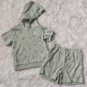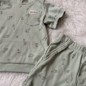 Charming hooded outfit with dinosaur print. Soft and cozy thermal fabric. Perfect for casual playing in the springtime and summertime. NWOT, not washed or worn, no flaws. Pet free and smoke free home