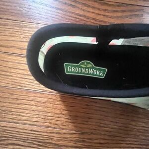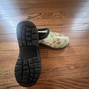 These GroundWork green strawberry clogs are the perfect casual shoes for women in size 8, with a slip-on style and flat heel for comfort. The round toe shape and low top shoe shaft style make them ideal for various occasions, especially for gardening activities in the summer, fall, or spring seasons. Made of rubber with a garden theme, these clogs are both stylish and practical, adding a touch of fun with the strawberry pattern. Smoke free home. Ships in 2 business days. Offers welcome!