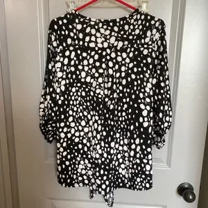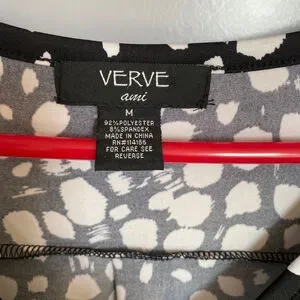 This is a pre-owned Verve Ami women's top in size medium. It features a black and white abstract print, a V-neckline with a button-up front, and 3/4 length sleeves with roll-tab cuffs. The top has a knotted hem detail. The fabric composition is 92% polyester and 8% spandex. No visible signs of wear or imperfections are apparent in the provided images.