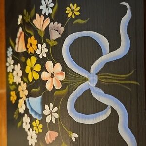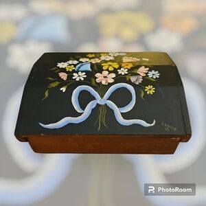 VTG 1980 Signed Floral Bow Handpainted Wood Jewelry Box