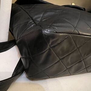 Elegant black quilted backpack. Features iconic gold CHANEL logo. Stylish and versatile design.