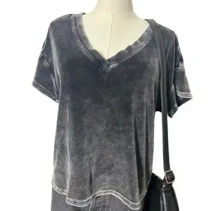 Keywords: Velvet, Velour, Acid Wash, Mineral Wash, Grunge, Boho, Bohemian, Casual, Soft, Luxe, Anthropologie, Gray, Charcoal, V-Neck, Short Sleeve