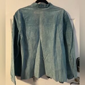 Retro Vintage Reversible Oversized Suede & Leather Jacket Lightweight Woman’s Blue & Grey. One side is suede feeling, one is a smooth leather, zip front, no brand/size tags. Could fit L - 2XL depending on desired fit/ look. Garment is a lighter-weight leather, more "shirt" like than jacket.