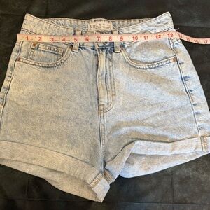 Trendy light wash denim shorts. Rolled hem and classic pockets. Ideal for everyday wear. Small stain in the back packet