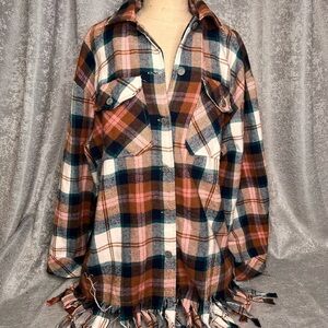 Vibrant plaid shirt with button-up design. Features a blend of orange, teal, and cream colors.