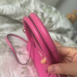 Elegant and fun Furla crossbody in vibrant fuchsia. Features sleek design and detachable and adjustable strap. Can be used as a satchel or small tote. Tiny signs at handles and hardware, see last 3 pictures.