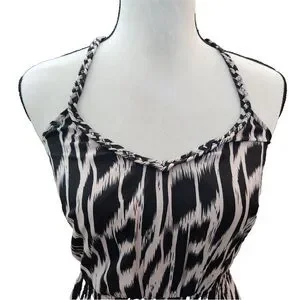 Stylish Charlie Jade dress with a zebra print. Features a halter neckline. Perfect for any occasion.