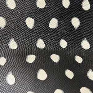 Elegant tote with playful white dots. Durable black leather like handles. This appears to be made of vinyl.