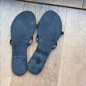 Sleek black sandals with minimalist straps. Perfect for versatile styling. Worn but still in descent shape. As is based on photos shown if you want more message me.