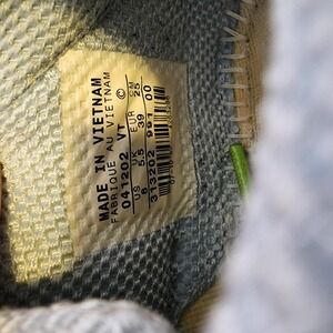 Good pre-owned condition overall. Missing insoles. Notable imperfections near the top lace holes on both shoes (see close-up photos). Soles show light wear with plenty of tread remaining.