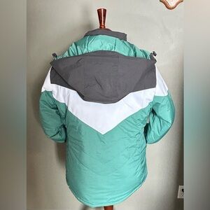 Teal and charcoal design. Ideal for skiing. Features a hood and zipper closure. This jacket is a 3 in 1 .