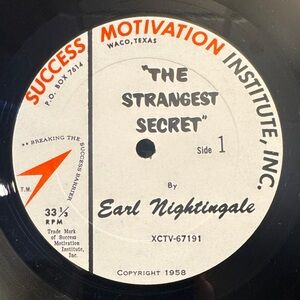 A vintage 33 long play record featuring Earl Nightingale's 'The Strangest Secret'.