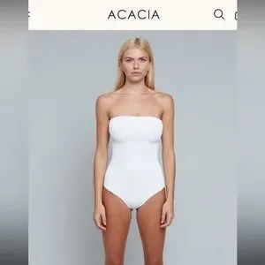 Elegant white strapless swimsuit by Acacia. Perfect for beach days. Acacia White Strapless Swimsuit. Brand new Acacia from new line. I just purchased but it’s too small. Brand new never worn. Beautiful thick fabric you will love 💗