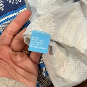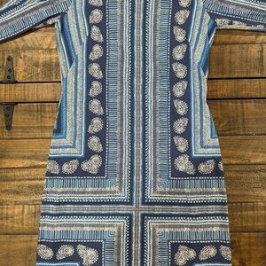 I have here this gorgeous blue floral paisley soft stretch business casual 3/4 sleeve knee length dress. This dress is by J. McLaughlin and is a size small.