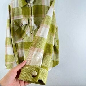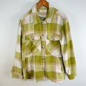 I have here this beautiful light green, pale pink and white plaid thick oversized button down shacket / jacket. This jacket is by Blank NYC and is a size X-LARGE.