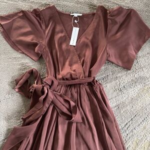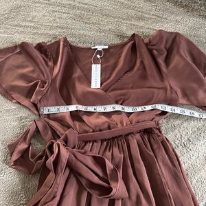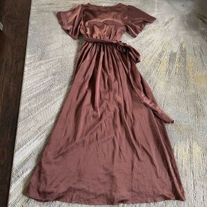 Earth town brown mauve color surplice neckline, flutter sleeves, long maxi length tulip-style skirt, elastic waist with with wrap tie belt