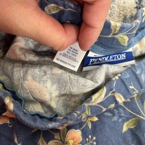 I have here this beautiful vintage 90s floral light blue linen rayon blend modest feminine prairie midi skirt. This skirt is by Pendleton and is a size 14W.