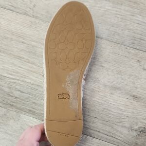 Elegant Coach espadrilles with signature pattern. Features tan and brown tones. Ideal for casual wear.