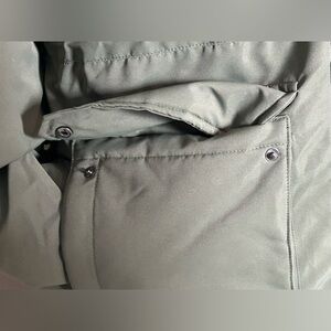 Cozy olive puffer with hood. Ideal for cold weather. This jacket is a long women’s puffer jacket with side zippers making it easier to loosen the jacket when you sit down. This jacket is a women’s size large