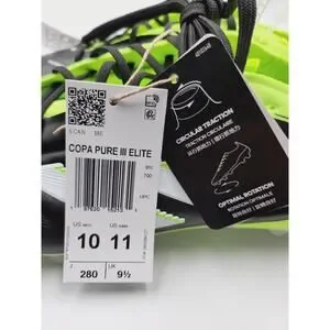 The product is a pair of Size 10 Men's Adidas Copa Pure III Elite FG Core Black Green Soccer Cleats, specifically designed for soccer players seeking high performance and style. With a sleek black design featuring the iconic Adidas branding, these athletic shoes are perfect for players looking for a durable and comfortable option on the field. The Copa Pure III Elite FG cleats offer a blend of quality materials and innovative technology to enhance performance during gameplay, making them a standout choice for any soccer enthusiast.