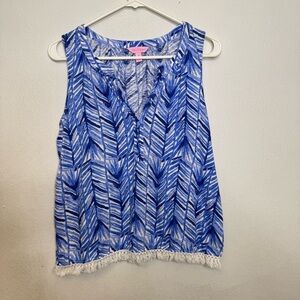 I have here this beautiful blue light weight tank top with a fringe tunic style details. This tank is by Lilly Pulitzer and is a size medium.