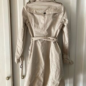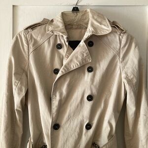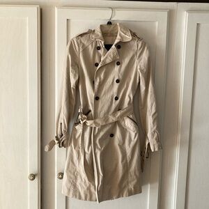 Light tan trench coat from Zara Basic. Simple and versatile design. Some markings on the coat’s left arm.