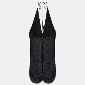 Elegant fringe black mini dress. Halter neck design. Perfect for evening wear.