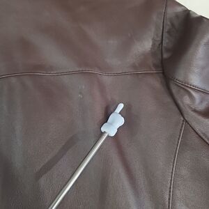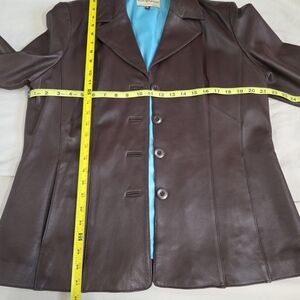 This Wilsons Women's Leather Jacket in size XL features a Y2K style design with a brown outer shell and teal polyester liner. The jacket is adorned with button accents and is perfect for adding a trendy and stylish touch to any outfit. Made for regular size women, this jacket offers both fashion and functionality for a unique and chic statement look.