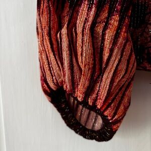 The Yulia Blouse is a forever favorite Ulla Johnson silhouette crafted this season from Ulla Johnson's eye catching batik printed lurex striped cotton silk. Long sleeve style featuring split neckline with self-tie, full sleeves, and elastic cuffs. My favorite part about the Yulia is that you can mix and match your jewelry because the top has both silver and gold metallic strands. Stunning and PERFECT for your fall wardrobe! Preowned no flaws.