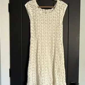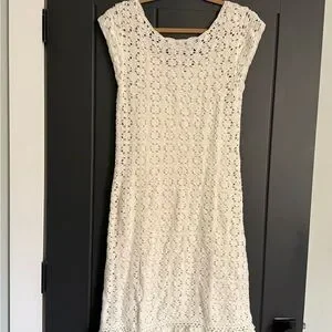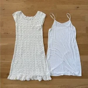 Chic white crochet mini dress. Perfect for casual outings. Soft and stylish. Comes with a detachable inner dress that allows for a versatile look.