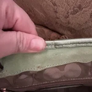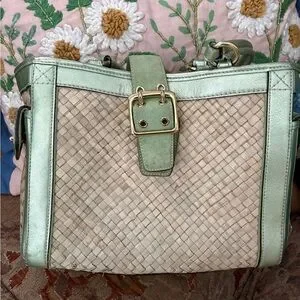 This stylish women's bag features a sophisticated woven design in green and tan. Perfect for any occasion, it combines elegance with functionality.