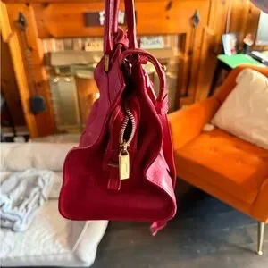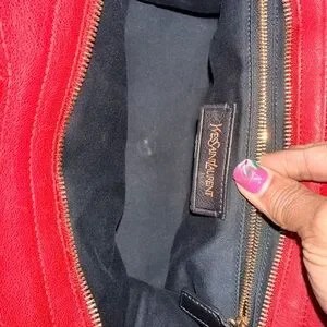 Chic red satchel with iconic YSL design. Luxurious leather and gold accents. Perfect for any occasion.