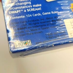 Swap The Swift Swapping Switching Slapping Card Game 2002 BOX Edition SEALED. Fun and engaging card game for 2 to 10 players. Suitable for ages 7 and up. Enjoy swift swapping and switching. The Swift Swappin' Switchin' Slappin' Card Game. Contains: 104 Cards and Game Rules. Play the game where your cards are never really your own. Portable, Travel, Fun.