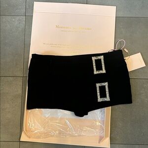 Made from suit fabric with slight stretch/ Low Rise/ Built in Shorts/ Two Wide Faux Belts Detailed With Large Silver Buckles/ Invisible Side Zipper For Closure