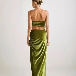 Ayre - Vera Dress in Green Velvet - Long straple dress in draped velvet with cuts along the torso, you can play with the length of the skirt. 90% polyester 10% spandex