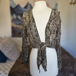 Chico's 100% Silk Leopard Print Blouse 0 XS Tie Front Mob Wife Crop Top Sexy